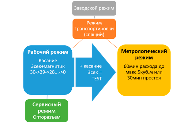 Метрологический режим ограничен временем на испытания 60 мин расхода, максимум 5 куб. м газа или 30 мин простоя. В случае неудавшейся смены режима или по достижению лимитов прибор вернётся в спящий режим.