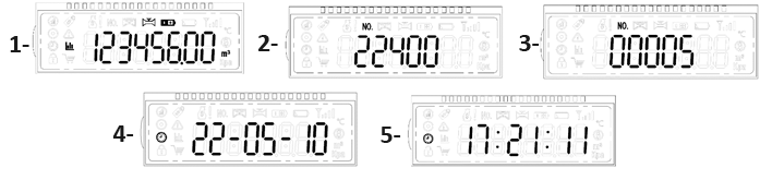 Замеренные показания объёма отображаются в кубометрах. Для удобства видеофиксации и простоты чтения после активации автоматически отображаются лишь 5 экранов (см. Рис. 02-2) каждый по 5 сек: